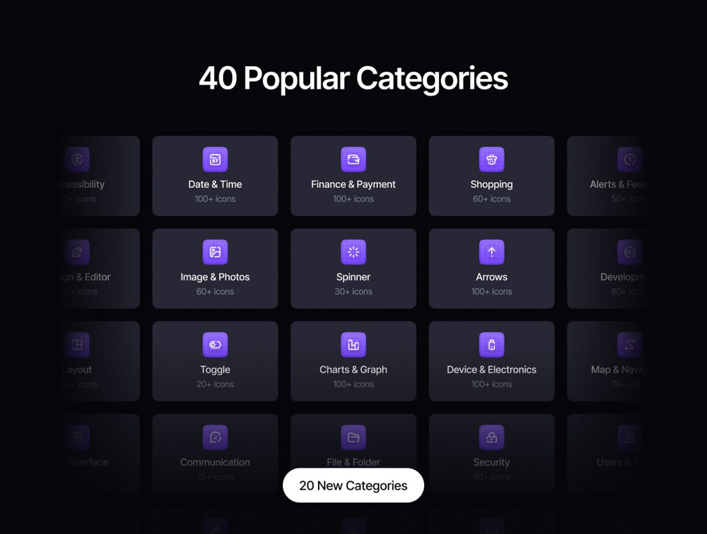 3000+ high-quality vector icons • 40 versatile categories • Multiple formats: SVG, PNG, EPS, AI • Light, regular & bold line styles • Easy to customize and scale • Pixel-perfect and modern design system ready