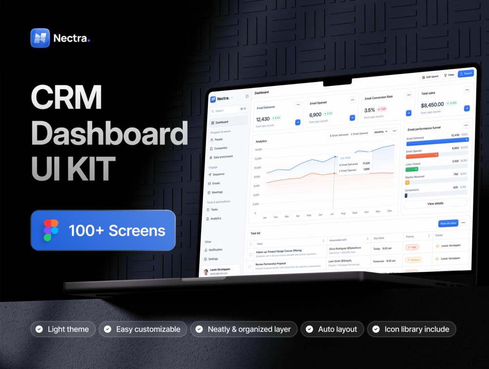 Nectra is a professional Customer Relationship Management Dashboard UI Kit designed for Figma, featuring over 100+ high-quality light page designs.